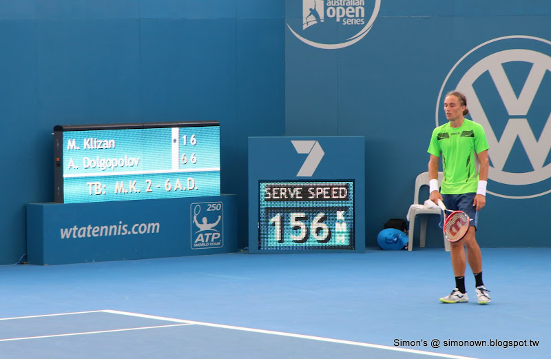 Dolgopolov 第一盤拿得很輕鬆,他的發球動作很快,個頭小但很精壯,第二盤雖然先被破但隨即破回,打進搶七後 Dolgopolov 拿到 6-2* 的四個賽末點領先。眼看比賽就要無懸念直落二結束,Klizan 硬是連續化解四個 MPs,6-6 的狀態再連保兩分,然後破掉對方發球,以連拿六分的方式搶下第二盤,光是這盤就打了 68 分鐘!決勝盤一樣進入搶七,Dolgopolov 再度在 6*-5 的狀況拿到賽末點,而且還是自己的發球分,這點拿下,下一球保發後依然又是 MP,結果這第六個 MP 還是拿不下,8-7* 後反而丟了發球分,Klizan 就拿下這唯一的 MP 也拿下比賽。最後一分打完剎那 Dolgopolov 生氣地大吼一聲,九成到手的比賽飛了,真的是氣到不行。